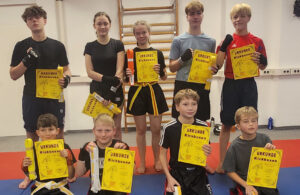 Glückwunsch an Adrian, Pepe, John, Maximilian, Amy, Leia, Benjamin und Malik zur bestandenen Gürtelprüfung im Kickboxen.
